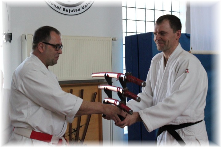 Überglücklich und völlig überrascht nahm er dann auch noch ein Schwerterset als Geschenk für die bestandene Prüfung von den Stendaler Dan-Trägern entgegen.